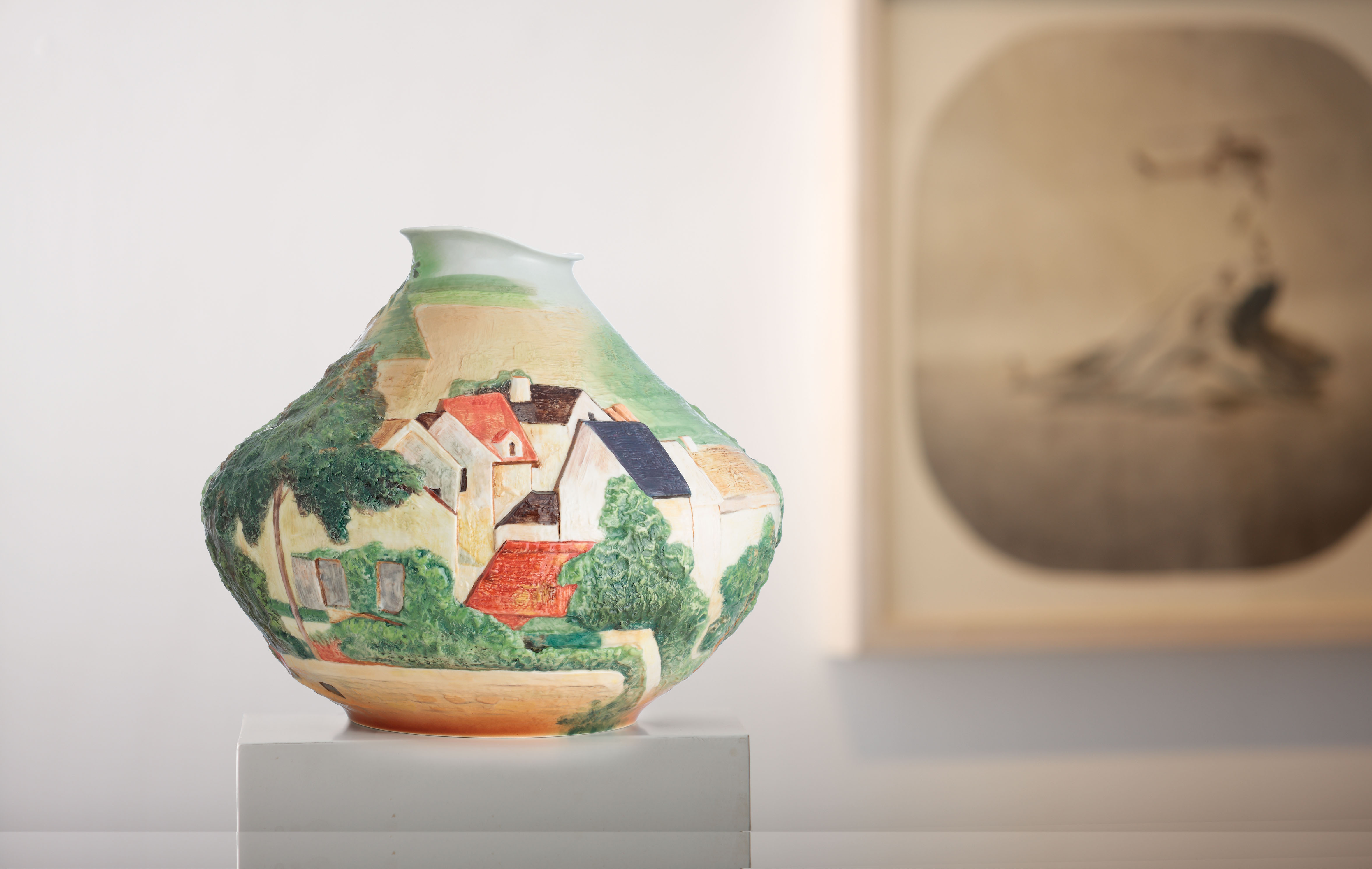C'ezanne is the father of modern art. He made a breakthrough by giving up the traditional and realistic frames. By using a solid and clear touch, he cut the countryside scene into geometrical patterns to create a new painting style. The mouth of the vase has a wavy design. The designer integrated soft lines and the technique to use a flat brush for thick paints in order to create gradation. He also showed the lively countryside scene with rich colors.