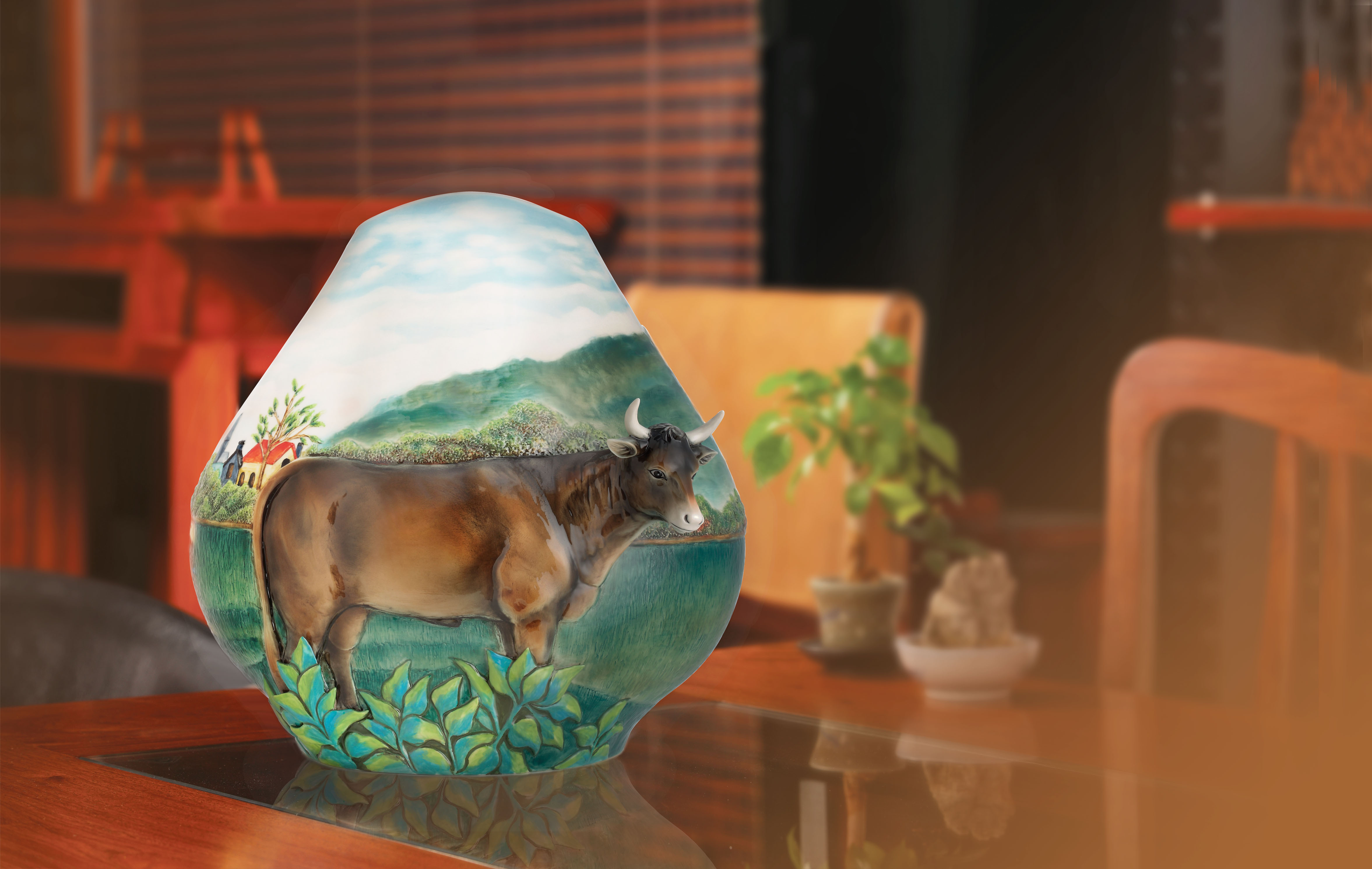 Rousseau was not bounded by the see-through technique of traditional painting. He enlarged the cattle in the painting and showed a new creative painting style. The Franz designer used the cattle in the painting as the theme for creation,integrating exquisite 3-D sculpture on the vase to echo the peaceful farms and natural setting. "Peaceful landscape" has a round shape to interpret the countryside’s perfection, creating an easy and peaceful ambiance.