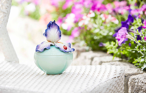 The iris flower derived its name from the Greek word for "rainbow" and thus the name also is a reference to the abundant variety of colors found among the species. The flowing lines and rich colors of the iris portray the vibrancy of life. Designed as a lidded box, the work is a reminder that happiness should be treasured.