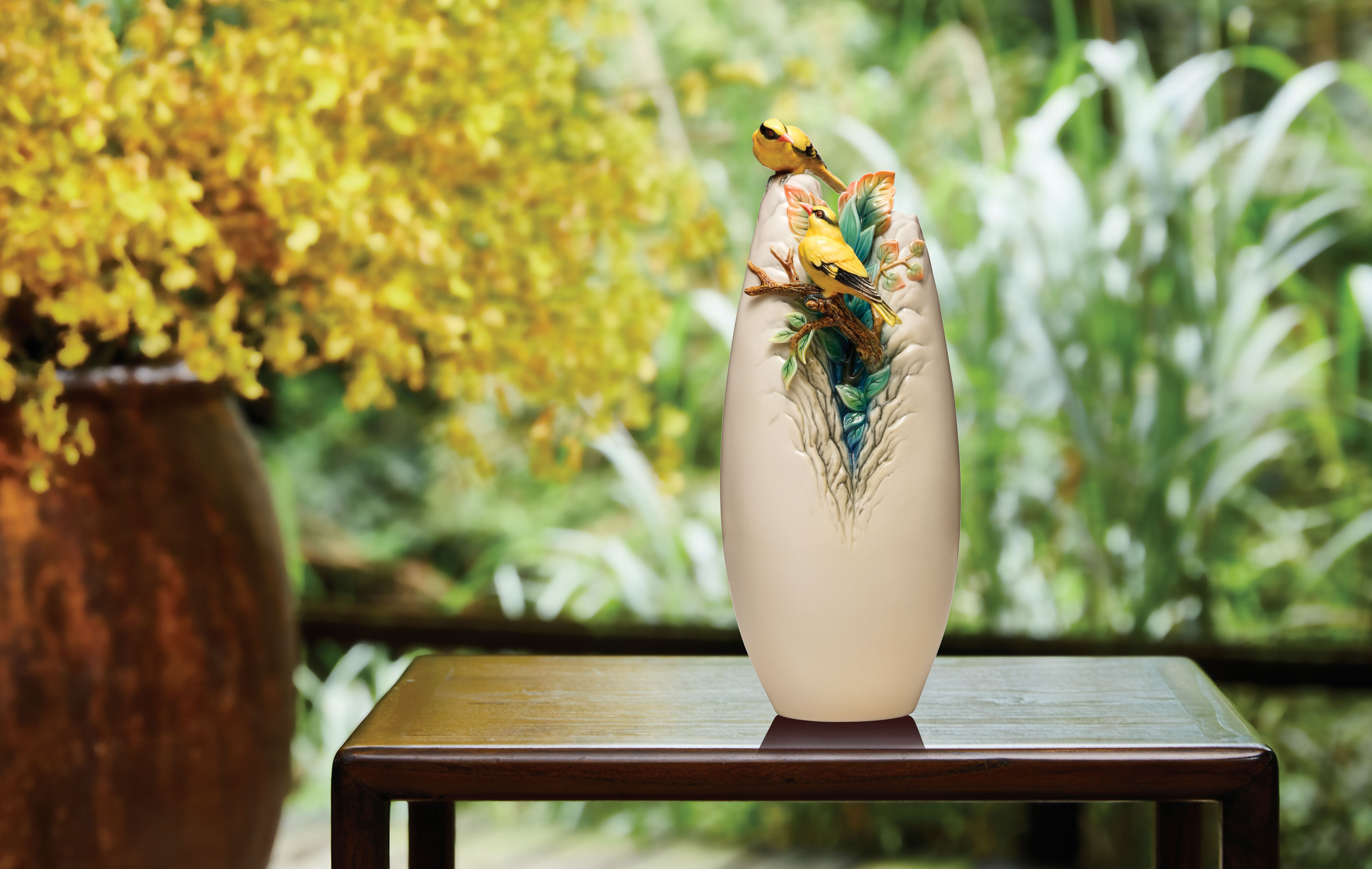 This piece is inspired by the delightful singing of orioles in the valley. On the vase, the orioles remain high on the branch, symbolizing an excellent performance and unparalleled singing.